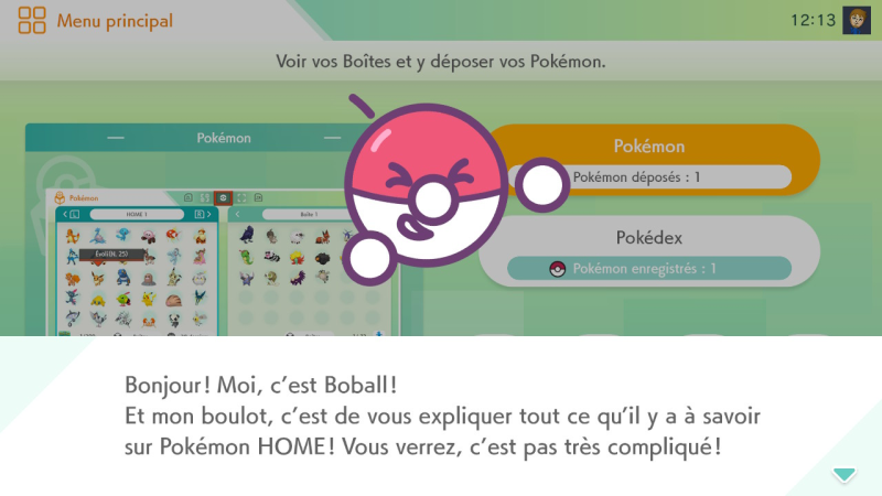 À partir de là, le jeu se connecte à internet, puis vous arrivez sur l'accueil de Pokémon HOME, où Boball vous attend pour vous présenter les fonctionnalités qui vous sont accessibles. Vous retrouverez la majorité des explications sur notre dossier !