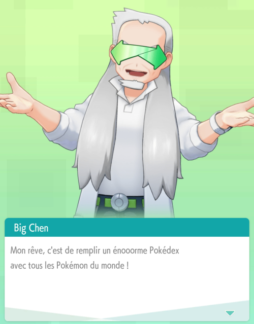 Big Chen vous demande de l'aider à compléter un Pokédex avec tous les Pokémon du monde et vous présente succinctement certaines des fonctionnalités qui pourront vous aider dans cette tâche. Finalement, il vous propose de choisir un Pokémon parmi les trois starters de la région de Kanto.