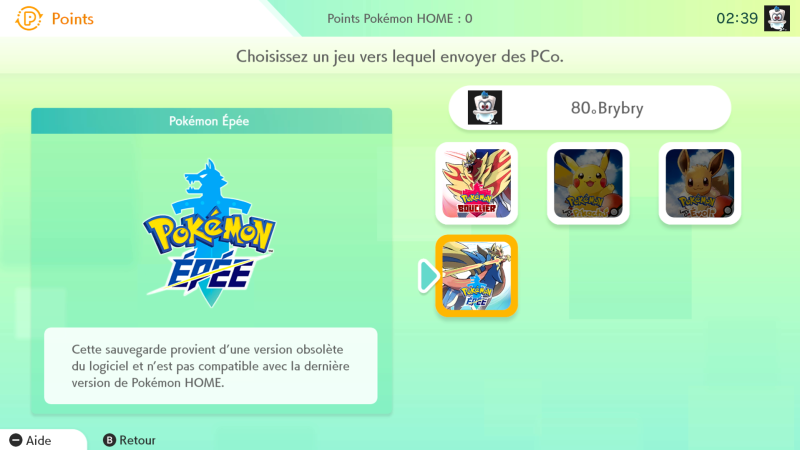 Afin que Pokémon HOME puisse accéder aux données de sauvegardes de vos jeux Pokémon Let's Go Pikachu et Évoli ainsi que Pokémon Épée et Bouclier, il faut que ces derniers soient sous leurs dernières versions. Si ce n'est pas le cas, vous verrez apparaître ce message lorsque vous tenterez de vous connecter aux boîtes PC de votre partie :