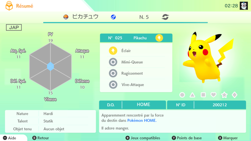 Note : En date du 12 février 2020, le Pikachu obtenu sur la version Switch semble légèrement "buggé" puisqu'il a son nom en japonais même si vous avez sélectionné le Français au démarrage de votre application (si vous avez activé la version switch de Pokémon HOME en premier il est japonais, si c'est la version mobile il sera alors bien français).