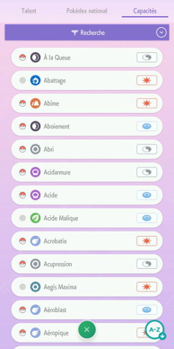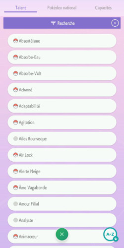 Sur la version mobile uniquement, il sera également possible de consulter la liste des talents qu'un Pokémon peut avoir en plus de ses statistiques (sous forme de graphique) ! Vous avez aussi accès à la liste des talents et capacités que vous avez répertoriés en déposant des Pokémon.