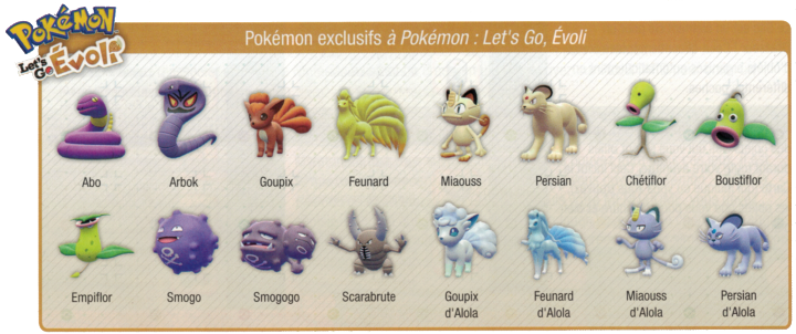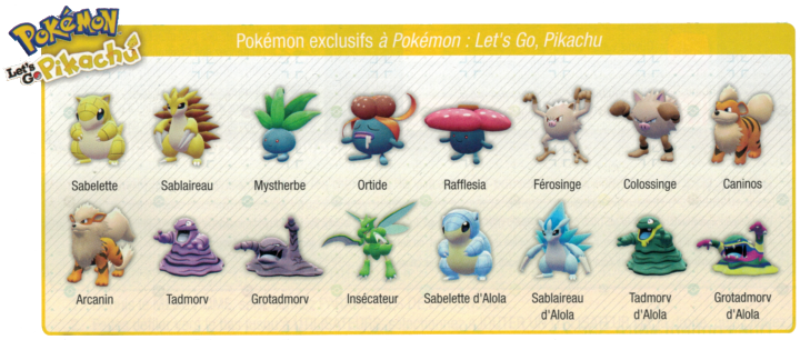 Les Pokémon exclusifs sont encore une fois de mise sur ces 2 versions. Vous devrez donc effectuer des échanges pour obtenir les Pokémon manquants à votre version Pikachu qui ne sont que sur la version Évoli et vice-versa (exception faite pour Arcanin sur Let's GO Pikachu et Persian sur Let's Go Évoli qui sont offerts).
