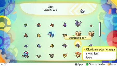 Une fois l'étape du code passée, vous arrivez sur l'écran d'échange et vous devez sélectionner le Pokémon que vous souhaitez échanger. Vous pouvez aussi voir quel Pokémon votre partenaire d'échange sélectionne et vérifiez ses informations. Lorsque vous êtes tous les deux d'accord, il vous suffit de lancer et de conclure l'échange (et en veillant, comme dans les versions précédentes, à ce que votre Nintendo Switch ne s'éteigne pas pendant que l'échange se réalise).
