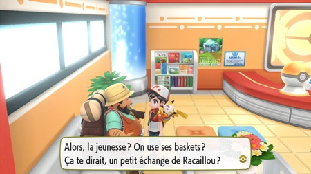Dans le Centre Pokémon de Carmin sur Mer, un montagnard fait des échanges de Racaillou.