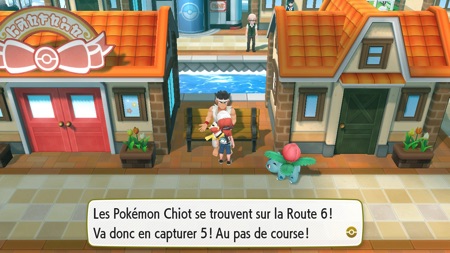 À Carmin sur Mer, au Sud du Centre Pokémon, un homme vous demande si vous préférez Miaouss ou Caninos. Peu importe votre réponse, il vous demande alors de capturer 5 Pokémon. Si vous réalisez la tâche, il vous offre un Pokémon dépendant de votre version : Persian si vous jouez à la version Pikachu et Arcanin si vous jouez à la version Évoli.