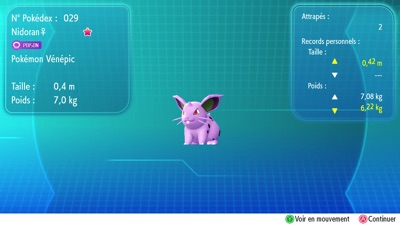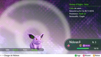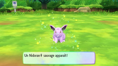 Pareillement à la rencontre avec un Pokémon sauvage, les rencontres avec les Pokémon Chromatiques se font également en direct avec le Pokémon visible à l'écran (sous sa forme chromatique excepté pour les légendaires fixes, donc dans notre cas un Nidoran Femelle Violet au lieu de Bleu). Il suffit ensuite d'interagir avec ce dernier (une petite étoile dorée, la même que sur Pokémon Ultra-Soleil et Ultra-lune apparaît alors pour vous signaler que ce Pokémon est Chromatique) et de le capturer.