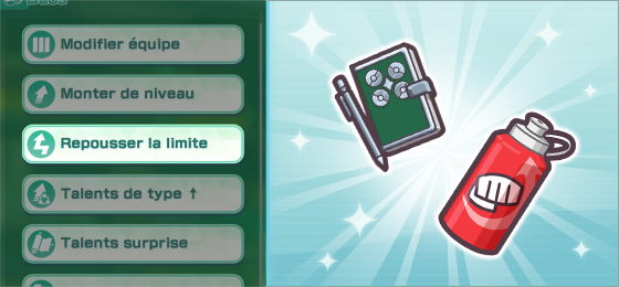 Formez des équipes avec des Duos d'un même type qui ciblent les faiblesses de vos adversaires. Utilisez les Talents d'équipe pour renforcer vos Duos. Vous pouvez améliorer le niveau des Talents d'équipe en remportant des Talents ↑ dans la Zone talents de type ↑ de la Zone d'entraînement. Utilisez-les ensuite sur les Duos de votre choix dans le menu Talents d'équipe.