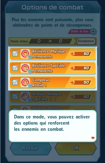 | Force ↑ 2 | Augmente la Force de tous les ennemis de l'équivalent de 20 niveaux. | 200 |