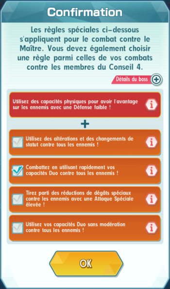 À propos des paramètres spéciaux : Au cours d'un évènement spécial du Combat de Maître, les paramètres spéciaux tels que « La puissance des capacités spéciales des ennemis et des alliés augmente. » sont définis pour les combats contre le Conseil 4. Ces paramètres changeront pour chaque victoire et les paramètres appliqués à chaque combat changeront à chaque fois qu'un évènement spécial est organisé. Deux paramètres sont appliqués aux combats vous opposant au Maître. L'un d'entre eux est prédéfini et vous pourrez sélectionner le second parmi les quatre utilisés lors des combats contre le Conseil 4.