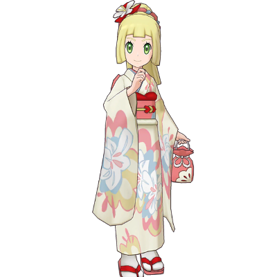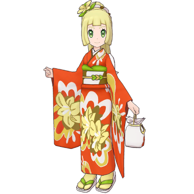 Lilie se bat dans des habits traditionnels de Johto. Les boules de pollen confectionnées par son Rubombelle sont si délicieuses qu'il leur arrive de s'en remplir l'estomac au point de ne plus rien pouvoir avaler d'autre.