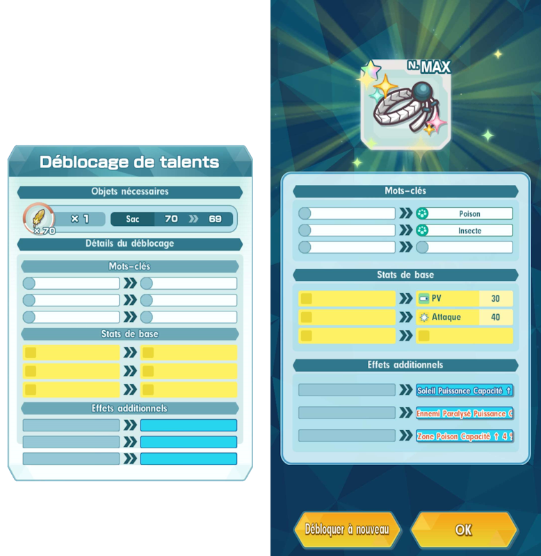 De base, les équipements de talent n'ont aucun effet, il est nécessaire d'utiliser une Plume Talent pour attribuer aléatoirement à un équipement à la fois jusqu'à 3 mots-clés, 3 boosts de stats et 3 effets additionnels. Pour cela, rendez-vous au Centre Pokémon, puis cliquez sur Duos > Équipement > Équipement de talent.