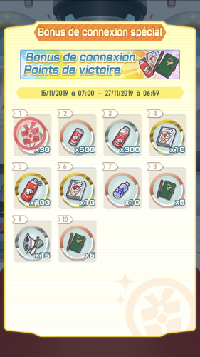 Un bonus de connexion de divers objets utiles était à récupérer sur 10 jours entre le 15 et le 27 novembre 2019 !