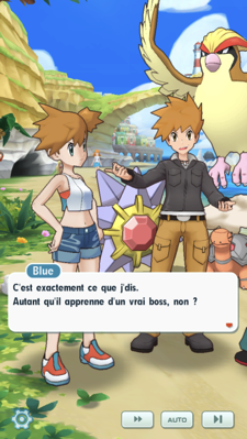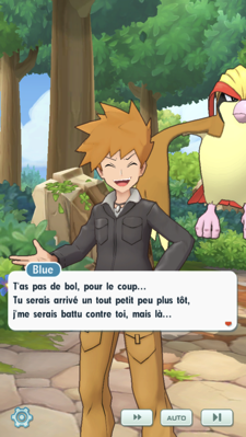 - Sous ses airs prétentieux et arrogant, Blue parvient à vous faire comprendre qu'il trouve que vous formez une bonne équipe. Il ne reste déjà plus que la finale pour voir le bout du tournoi et vous apprenez via un message d'Ondine que son équipe a été vaincue. Il paraît très surpris que quelqu'un ait pu venir à bout de la Championne d'Arène d'Azuria, et semble s'inquiéter d'avoir à faire face à quelqu'un de particulièrement doué. Ondine vous rejoint et lui transmet un message suggérant que Blue a déjà vaincu ce dresseur par le passé. Il ne s'agit en fait de personne d'autre qu'Aldo, du Conseil 4 de Kanto !