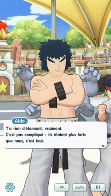 - Blue vous félicite avec moins de retenue pour cette victoire ! Aldo vous complimente également et vous informe qu'un match retour contre lui serait le bienvenu ! Adriane souhaite poursuivre son entraînement avec l'homme du Conseil 4, ce qui semble marquer la fin de votre équipe, et donc du scénario de cet événement ! Blue vous indique que vous le reverrez prochainement !