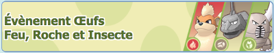 ![]() Évènement Oeufs Feu, Roche et Insecte11 missions Duos à l'affiche Combats Solo | Du 17 décembre 2020 au 31 décembre 2020 |