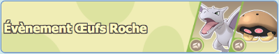 Ces événements permettent de réceptionner des Pokémon dans des Oeufs d'un certain type et/ou particulier en réalisant les différents combats. Ainsi, en les faisant éclore, vous pouvez former des duos inédits.| Nom de l'événement | Disponibilité |