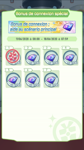 Un bonus de connexion (lié à l'ajout des nouveaux chapitres du scénario principal) comprenant 100 Diamants par jour, était à récupérer sur 7 jours entre le 11 juin et le 18 juin 2020 !Recherche