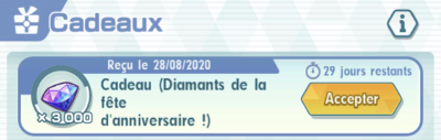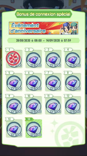 3000 Diamants ont été offerts à tous les joueurs pour fêter ce premier anniversaire du jeu (jusqu'au 14 septembre). De plus, un bonus de connexion offrant de 100 à 500 Diamants par jour (3 000 Diamants au total) était à récupérer en vous connectant sur 14 jours.