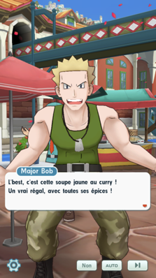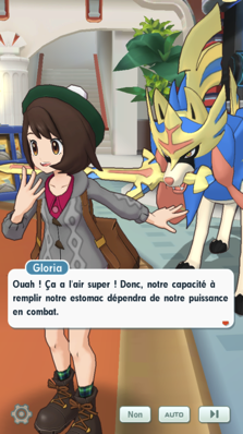 - Alors que la fête au buffet bat son plein, vous assistez à une défaite de Pierre face à Amaro. Ils luttaient en fait pour gagner un plat ! Quant à vous, vous êtes de sortie avec Gloria, accompagnée de son Zacian. Elle vous suggère de vous dépêcher si vous voulez goûter aux différents mets avant que tout ne soit dévoré ! Vous passez devant le stand du Major Bob, qui a préparé du curry, un plat qui rappelle à votre nouvelle amie de bons souvenis de camping à Galar. Son ventre se met directement à gargouiller, elle aimerait vraiment y goûter ! L'ancien soldat raconte qu'il préparait ce plat à ses camarades. Mais voilà que Mélina débarque et souhaite également déguster ce plat. Vous comprenez au défi que les deux filles se lancent que pendant cette fête