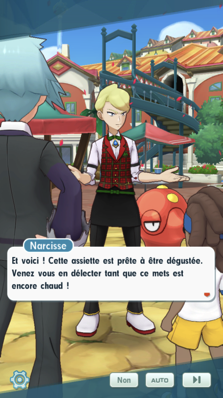 - Une fois vaincue, Mélina fécilite son adversaire du jour et reconnaît sa défaite mais compte bien mieux faire lors de leur prochaine rencontre. Elle s'en va, laissant Gloria, très contente et pressée de dévorer sa soupe au curry, elle décide de trouver un endroit où vous pourrez déguster tranquillement. Mais avant même que vous bougiez le petit doigt, une odeur de spaghettis à l'encre d'Octillery attire son attention. Il s'agit en fait d'un plat concocté par le chef Narcisse, qui a ressorti sa tenue saisonnière pour l'occasion ! Gloria est immédiatement tentée d'aller y goûter, malheureusement, il n'en reste plus qu'une assiette, et encore une fois, quelqu'un d'autre est intéressé par le mets. Ce coup-ci, c'est le Pierre Rochard qu'il faut affronter pour avoir droit de déguster !