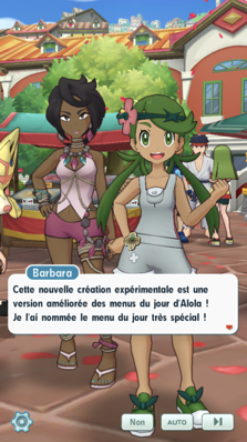 - Une fois encore, il semblerait que personne, pas même le Maître de Hoenn, ne puisse résister à la puissance du légendaire Zacian. Vaincu, Pierre Rochard vous félicite puis s'en va. Alors que Gloria s'adresse à vous et tourne le dos à son Pokémon, celui-ci s'enfuit ! En vérité, il n'est pas alé bien loin : il s'est en fait approché du stand géré par deux jeunes femmes connues de la région d'Alola : la Doyenne Alyxia et la Capitaine d'Épreuve Barbara. Avec son nez très entraîné, Gloria reconaît tout de suite l'odeur des Baies Lansat, qu'elle cuisinait régulièrement en camping. C'est sans doute ce qu'a flairé Zacian, qui a dû se sentir nostalgique. Vous décidez de vous approcher et apprenez de la bouche-même de Barbara que le plat à base de ces Baies est une version améliorée d'un menu du jour d'Alola. Alyxia précise qu'elles ont utilisé des ingrédients de Passio pour cette nouvelle recette et vous invite à savourer tant que c'est chaud. Cependant, là encore, une autre personne souhaite y goûter : c'est Jasmine, qui s'est rendue à la fête exprès pour goûter ce fameux plat !