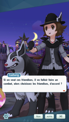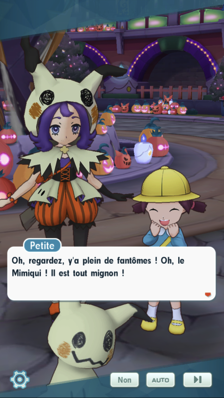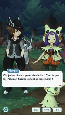 - Toute la ville de Cordis a été redécorée dans l'ambiance d'Halloween ! Des enfants s'amusent quand vous arrivez sur la grande place en centre-ville. Un Mimiqui s'approche de votre Pikachu et vous remarquez Margie et Ludwig, arborant tous deux de nouveaux costumes pour l'occasion de la fête des morts ! Pikachu est intrigué par ce nouveau partenaire de Margie qui imite son apparence, et celle-ci pense que cela signifie que votre Pokémon est prêt à devenir ami avec son Mimiqui. Intrigué par l'absence des Pokémon actuels de vos interlocuteurs, vous leur demandez ce qu'ils en ont fait. Ils les ont en fait laissés au foyer dont s'occupe Margie à Alola. Vos compagnons costumés souhaitent eux aussi se prêter au jeu du "un combat ou un sort" !