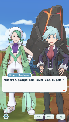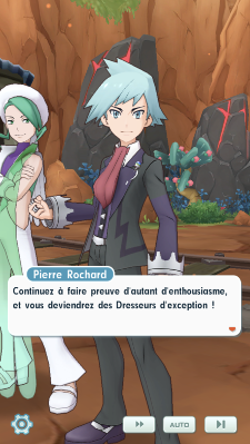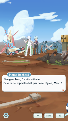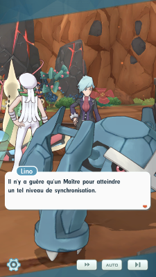 - Malgré la supériorité numérique de vos adversaires, Marc et Pierre semblent très bien gérer leurs combats. Après ces affrontements, Lino, qui a pu les voir à l'oeuvre, se présente à vous et semble admiratif ! Après une petite discussion, Marc vous questionne sur les pierres que vous avez trouvées. Pierre a reconnu qu'il s'agissait de géodes, un type de pierre assez rare. Il en possède pourtant un bon nombre dans sa collection et s'étonne d'en trouver dans une région artificielle comme Passio. Lino demande ensuite à affronter le riche collectionneur de cailloux, mais ce sera à vous d'aider ce dernier, car Marc préfère se reposer après tous ces combats.