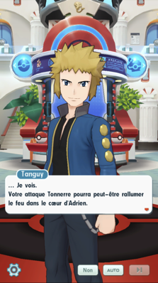 - Le combat entre vos trois Pokémon fait rage, électrisant l'atmosphère et envoyant des gerbes d'étincelles dans tous les sens ! Mais de nouveau, une panne de courant survient, et le Luxray de Tanguy fait alors office de source lumineuse en attendant que cela soit réparé. Imperturbable, Adrien reste toujours isolé dans son coin, et son ami décide de le solliciter directement pour qu'il participe au match, ce qui semble porter ses fruits ! Le Conseil 4 de Sinnoh n'avait vraiment pas conscience de son environnement et vous prenez donc le temps de lui expliquer ce que vous faites tous ici. Tanguy lui rappelle qu'il lui était redevable depuis la fois où Adrien l'avait aidé à retrouver goût aux combats de Pokémon, il était normal qu'il en fasse de même en voyant son ami dans une situation similaire. En vérité, Adrien s'est tellement entraîné avec une machine empruntée à un Karatéka pour prouver à son ami que le type Feu était le meilleur, qu'il a fini par s'épuiser sans s'en rendre compte. Il souhaite lui demander quelque chose, mais surgie de nulle part, la Team Break profite de sa fatigue pour attaquer !