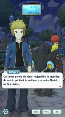 - C'est en fait une panne de courant qui vient de survenir, éteignant toutes les lumières de la ville ! Alors que vous paniquez dans l'obscurité, Tanguy vous rassure en disant que l'électricité sera sans doute bientôt rétablie, et c'est en effet ce qui se produit peu après. La lumière revenue, Lem s'avance à votre rencontre et vous explique qu'il cherche la cause de la panne de courant. Il fait connaissance avec Tanguy, qui lui demande si l'appareil que porte Lem est inspiré de la queue d'un Capumain. Lem approuve et ils réalisent en discutant qu'ils ont des centres d'intérêt commun, comme la science et les machines, en plus de diriger tous deux des Arènes spécialistes du type Électrik.