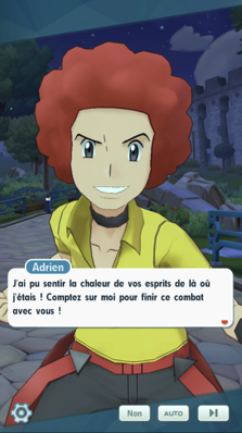 - Le soir, vous rejoignez Tanguy à la sortie de Cordis et vous y trouvez Adrien, apparemment épuisé. Son ami vous explique que chacun d'eux a sa préférence entre les types Feu et Électrik, et ils comptaient déterminer lequel était le meilleur ce jour-là avec un combat. Mais le membre du Conseil 4 n'a jamais rejoint Tanguy, et c'est ici que ce dernier l'a retrouvé, comme s'il était déconnecté de ce qui l'entoure. Tanguy pense que cela doit faire suite à un match particulièrement intense, et il vous demande de l'aider à faire réagir son ami. Il pense qu'un combat entre vous deux devrait suffire à cela. Vous acceptez la proposition, mais soudain, tout devient noir.