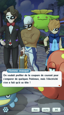 - La bande de malfaiteurs projettait de profiter de la panne de courant pour voler des Pokémon et a entendu ces histoires de dresseurs fatigués, c'est pourquoi les voilà pour s'en prendre à vous ! Le Champion et le membre du Conseil 4 vous écartent du champ de bataille, souhaitant se débarasser de la menace sans vous mêler à leurs problèmes plus qu'ils ne l'ont déjà fait. Évidemment l'Octillery des ennemis ne fait pas le poids face à Luxray qui l'élimine sans mal, faisant aussitôt fuir les agresseurs. Lem et vous êtes impressionnés par leur puissance, et le Champion d'Illumis souhaite boire quelque chose après ces péripéties. Malheureusement, le distributeur de boissons et plusieurs autres machines ont de gros problèmes de fonctionnement en raison des coupures de courant.