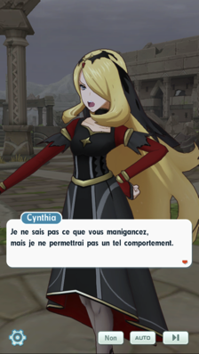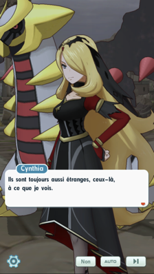 - Cynthia a enfilé un nouveau Look Ultime et vous enquêtez avec elle dans les ruines artificielles de Passio. Cela a permis à la puissante Dresseuse de Sinnoh de comprendre pourquoi son Giratina accordait une attention toute particulière à ce lieu. Mais avant qu'elle n'ait le temps de vous en dire plus, vous êtes interrompus par des sbires de la Team Galaxie ! Ceux-ci la somment de leur livrer ses Pokémon sans lutter et ils menacent de s'en prendre directement à vous si elle ne coopère pas. Ils font appels à leurs Pokémon Spectre, mais comme toujours, Cynthia n'a pas l'intention de se laisser impressionner et elle fait intervenir son Giratina !