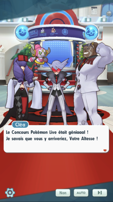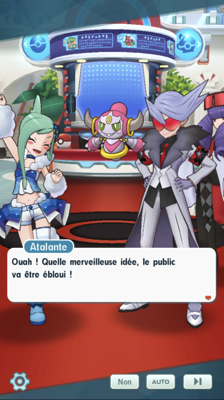 - Au Centre Pokémon, Hoopa a fait apparaître Atalante ! Le prince de Passio débarque avec ses acolytes et somme le Pokémon de la renvoyer d'où elle vient, mais toujours aussi farceur, celui-ci n'en fait qu'à sa tête. Atalante vous apprend en plus qu'elle était en plein milieu d'un Concours Pokémon Live : le public risque de s'inquiéter de son absence ! Alexis décide alors d'escorter la starlette et de distraire les gens avec un combat Pokémon en attendant son retour. Pour que tout le monde pense que tout ceci était prévu, il demande à Elvis de retransmettre le retour d'Atalante sur scène en la filmant sur le chemin. Le roi de Passio compte bien tout arranger !