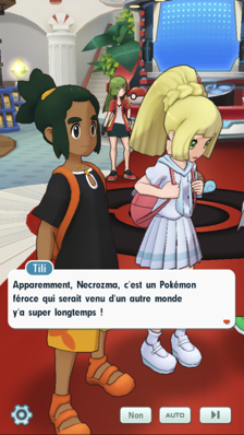 Malgré la mise en garde d'Elio, ils se moquent que ce Pokémon soit en souffrance et reconnaissent que leur objectif est purement égoïste. Révoltée par leur attitude, Lilie fait appel à son Lunala pour se débarrasser de l'équipe de sbires. Mais à la simple vue de son Pokémon légendaire, ils prennent peur et renoncent à leur projet. Soudain, dans un puissant éclat lumineux, Necrozma apparaît devant vous ! Les sbires reviennent aussitôt sur leur parole et le prennent de nouveau d'assaut, mais leurs Pokémon ne font pas long feu face à sa puissance.