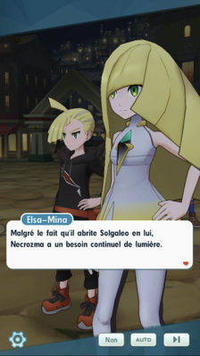 - Déjà mal en point lorsqu'il est arrivé à Passio, le Pokémon légendaire est toujours dans une colère noire, il ne vaut mieux pas trop l'approcher dans cet état. Elsa-Mina va tenter une autre approche : lui témoigner de ses sentiments profonds pour tenter de le calmer, comme elle l'a appris avec ses enfants. Seulement accompagnée de son Mélodelfe, elle s'avance donc seule vers Necrozma pour essayer de le guérir de ses blessures et lui exprimer ses souhaits.