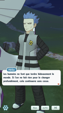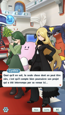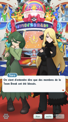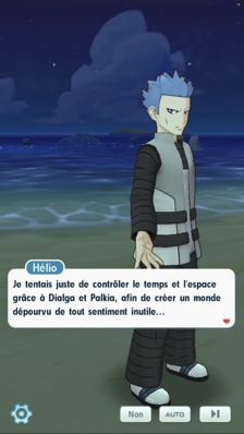 - Un soir, sur la plage de Passio la Team Break se lamente de ne parvenir qu'à voler des Pokémon faibles et est toujours en quête de Pokémon plus puissants pour mener à bien leurs projets. C'est alors que Hélio et son Palkia apparaissent dans un flash lumineux, se demandant où ils ont atterri. Les deux Sbires décident de s'y frotter pour s'emparer du Pokémon légendaire, mais ne font pas le poids. De votre côté vous retrouvez Sara et Cynthia au Centre Pokémon. Le Maître de Sinoh souhaite que vous partiez à la recherche de cette personne qui a blessé les deux pauvres sbires. Cynthia a déjà une idée de qui est cet individu et si ses craintes sont fondées, le monde est en danger.