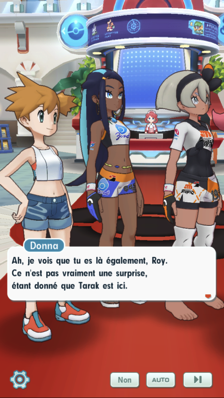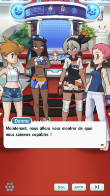 De retour au Centre Pokémon, nos quatre championnes reviennent de leurs combats et sont rejointes par Roy. Sachant que son rival Tarak est lui aussi présent sur l'île artificielle, Donna n'est pas surprise de le voir ici également, mais reste impressionnée de voir un tel rassemblement de Dresseurs de haut niveau ! Faïza explique que la pression pour rester en première division du Défi des Arènes à Galar leur a forgé un mental à toute épreuve, leur permettant de donner leur meilleur à Passio ! Elles ont même réussi à gagner l'approbation d'Ondine et Mélina ! Après ces matchs, Donna propose d'aller manger tous ensemble pour reprendre des forces et fêter ça et Roy compte leur faire découvrir un endroit où elles pourront faire un bon repas !Récompenses (1ère fois)