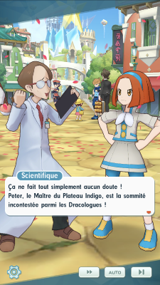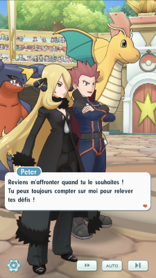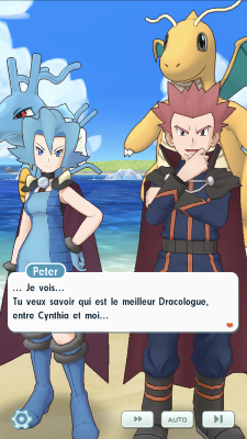 - Les deux admiratrices vaincues vous laissent, ce qui permet finalement à Écho de demander à Peter son avis concernant qui est le meilleur Dracologue Cynthia et lui. Évidemment, Sandra ne peut s'empêcher d'intervenir afin de prêcher pour elle-même, mais Peter lui conseille d'être plus modeste, car si elle est forte, un excès de confiance en elle pourrait facilement la faire tomber de haut en cas de défaite. Le Maître est du même avis de Cynthia et ne semble pas accorder beaucoup d'importance à ces préoccupations, connaissant le statut temporaire de qui est supposé être le meilleur. Il évoque sans donner de noms sa défaite face à Blue d'il y a plusieurs années, alors qu'il était un membre du Conseil 4 de Kanto. A peine couronné Maître, le jeune dresseur s'était vu à son tour surpassé par Red, son rival. Finalement, Peter se contente de se perfectionner encore et encore sur ses points forts. Après cette discussion, Peter souhaite visiter Passio et Écho se propose pour lui servir de guide. Vous repartez donc en ville, laissant Sandra pensive. Pendant la visite, vous recroisez Cynthia, qui vous rejoint. Après une petite discussion entre les deux Maîtres qui semblent finalement bien décidés à s'affronter, un Topdresseur ptétendant au titre de meilleur Dracologue surgit de nul part et souhaite les mettre à l'épreuve. Peter et Cynthia décident alors de s'allier avec vous pour ce combat !