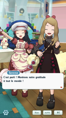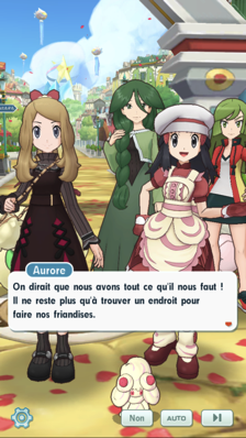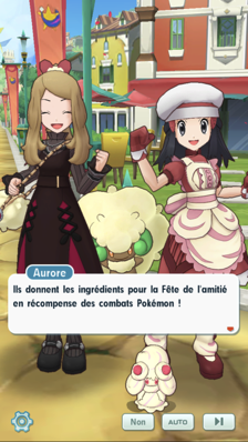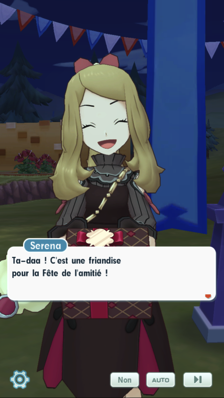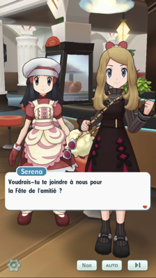 - Au Centre Pokémon, vous croisez la route de Serena et Aurore sous un nouveau look. Elles souhaitent que vous vous joigniez à elles pour la Fête de l'amitié, dans laquelle on offre des douceurs aux personnes que l'on aime ! Elles comptent fabriquer elles-même leurs propres pâtisseries et décident de partir avant vous pour se procurer les ingrédients nécessaires.