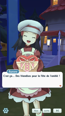 En vous dirigeant vers le magasin où vous trouverez tout cela, vous croisez la route de Sara et une Topdresseuse. Cette dernière explique qu'elle voudrait montrer à quelqu'un à quel point elle l'apprécie, mais qu'elle n'est pas du tout douée pour réaliser des friandises. Vous acceptez bien volontiers de vous joindre à elles !Récompenses (1ère fois)