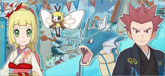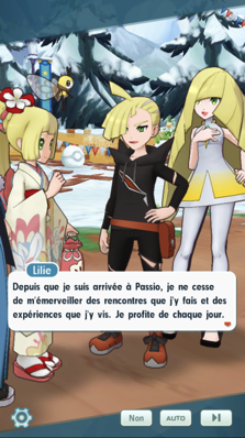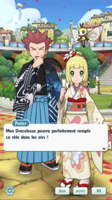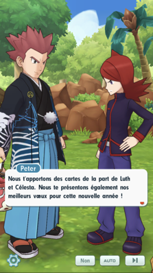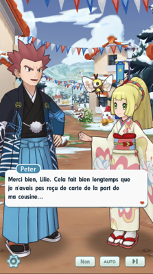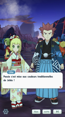 - Sur les flancs du volcan de Passio, vous croisez la route de Lilie et Peter habillés en kimonos. Ils portent ces tenues traditionnelles de Johto à l'occasion de cette nouvelle année, et vous présentent leurs voeux ! Ils vous apprennent que des cartes de voeux décorées aux motifs inspirés de Johto circulent dans Passio et vous invitent à les rejoindre pour partir à la recherche de ces cartes en ville.