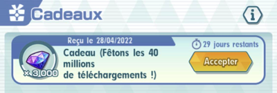 Un bonus de connexion offrant des Diamants était à récupérer en vous connectant sur 14 jours.| Célébration des 40 millions de téléchargements | ||