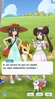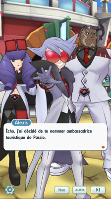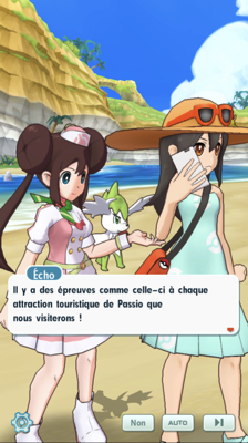- Vous voilà en plein centre ville aux côtés d'Écho ! Le prince Alexis et ses deux acolytes arrivent pour faire une annonce à votre amie : elle est nommée ambassadrice touristique de Passio ! Le prince compte sur vous pour aider la jeune dresseuse. En effet, avec votre popularité et la sienne, Alexis est persuadé que l'île de Passio sera encore plus attrayante et attirera de puissants adversaires ! Cléa et Elvis sont impressionnés de voir leur chef si attentionné aux dresseurs de Passio et à l'image que renvoie l'île. Après quelques instants de réflexion et avec les encouragements de son Shaymin, Écho accepte la proposition !