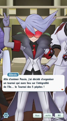 - Vous voilà dans la Villa d'Alexis, où le prince et ses deux acolytes sont en plein tournage pour l'annonce de l'ouverture d'un nouvel évènement : le Tournoi des 5 pépites ! Il consiste en la création de deux groupes de Duos en costume, qui s'affronteront dans la quête de retrouver et rapporter dans leur camp un maximum de "Grandes Pépites" parmi les 5 qui sont cachées à travers Passio. Il est possible d'affronter un adversaire qui tente de ramener une de ces pépites pour l'en empêcher.