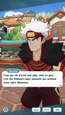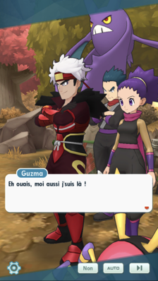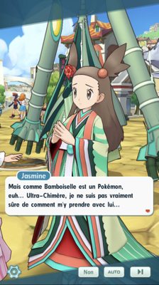 Plus tard, Guzma et de nombreux Dresseurs se regroupent dans la forêt au feuillage désormais automnal de Passio. Koga, Jeannine, Erika, Albert et Valériane ont été sélectionnés pour être dans son équipe. Alors qu'ils s'en vont pour démarrer leur mission, Jasmine se trouve bien embêtée pour marcher avec sa longue tenue qui traîne sur le sol. Pieris (avec son look jeux se déroulant à Alola) surgit alors pour lui porter secours.