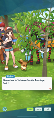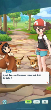 - Nouvellement arrivée à Passio, Elaine consulte une vidéo qui évoque la présence dans la région d'un Évoli très spécial qui serait capable de parler. Accompagnée par son propre Évoli, elle compte partir à sa recherche. Elle se rend alors en forêt et tombe rapidement sur une voix criant le nom d'Évoli et s'approche discrètement de l'origine du son. Elle trouve un énorme spécimen sur deux pattes et un plus petit, bien plus normale. Elle saute sur le premier, qui s'avère en fait être une petite fille portant un déguisement ! Après la surprise et le choc, elle se présente à son assaillante qui vient de comprendre son erreur : il s'agit d'Eva, une jeune Dresseuse originaire de Galar qui adore se déguiser en Pokémon !