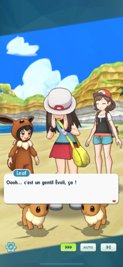 Un peu plus loin, elles abordent Leaf, Ondine, et Erika qui font elles aussi équipe avec des Pokémon de la famille du petit Pokémon Évolutif qui n'ont pas non plus connaissance de l'existence d'un Évoli si spécifique. Ondine se montre très sceptique tandis qu'Erika se dit que si un Pokémon en est vraiment capable, il cache sûrement son don pour rester tranquille.