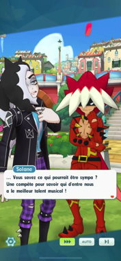 - Maintenant que le "combat musical" est annoncé, il faut définir les règles de la compétition. Ils décident de former des équipes de trois Duos comme lors des combats de Passio et peu importe si leurs alliés sont des musiciens professionnels ou non. Solane se souvient d'un concert estival où Célesta avait mis une belle ambiance en chantant avec son Rondoudou, et il pense également sans mal à la vedette Atalante, qui sait mettre des étoiles dans les yeux de son public. L'héroïne de Johto est partante, mais Atalante est, quant à elle, déjà prise pour enregistrer une émission sur les combats Pokémon à la date prévue pour le concert.