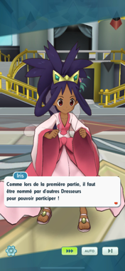 - Après la cérémonie, Alexis, pris au dépourvu par cette annonce d'une seconde partie de Combat de Néo-Maître, sermonne Iris mais il accepte néanmoins son idée afin de ne pas décevoir le public et les futurs participants. Comme lors de la première partie, les participants ne peuvent pas se présenter par eux-même, il faut qu'ils soient choisis par d'autres Dresseurs. Mais cette fois, l'objectif n'est pas forcément de combattre, mais d'émouvoir le public grâce à n'importe quel type de performance !