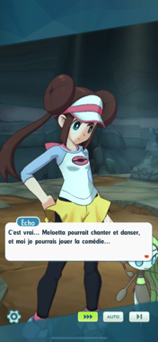 - Matis est là aussi, c'est d'ailleurs lui qui a fait venir les starlettes au secours d'Écho et Meloetta pour leurs répétitions ! Écho leur présente son partenaire qui est capable de changer de forme grâce à sa capacité Chant Antique, et la voix du Pokémon est exceptionnelle et mériterait d'être entendue par tous, mais le Pokémon reste très timide. Devant ce petit public restreint, le Pokémon accepte de faire une démonstration des pouvoirs de sa voix, et se transforme alors avant de se mettre à danser. À nouveau, la danse lui permet de se métamorphoser et de reprendre sa forme initiale. Émerveillées, les filles demandent à Écho si elle compte plutôt chanter ou danser lors de la réprésentation. La Dresseuse d'Unys hésite encore, mais elle réalise en discutant qu'elle est déjà plutôt douée pour jouer la comédie, elle se dit alors qu'une mise en scène serait idéale pour mettre en valeur les talents de son Pokémon. Elle décide finalement de créer une comédie musicale, et file aussitôt en ville pour mettre en œuvre son idée.